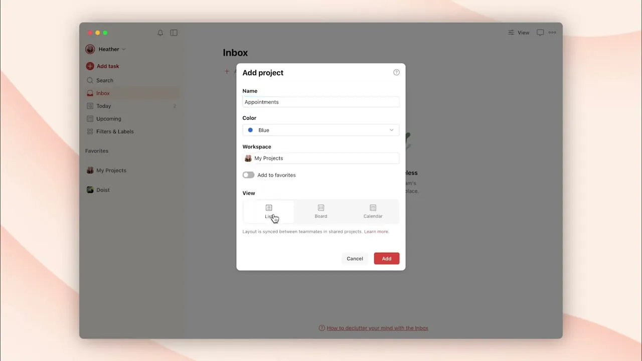 Projekt vytvoříte tak, že v navigační nabídce vedle položky Moje projekty vyberete ikonu plus. Přidejte název projektu, vyberte mu barvu a zvolte si, jestli ho chcete vidět jako seznam, nástěnku, nebo kalendář (k dispozici jen uživatelům tarifů Pro a Business).