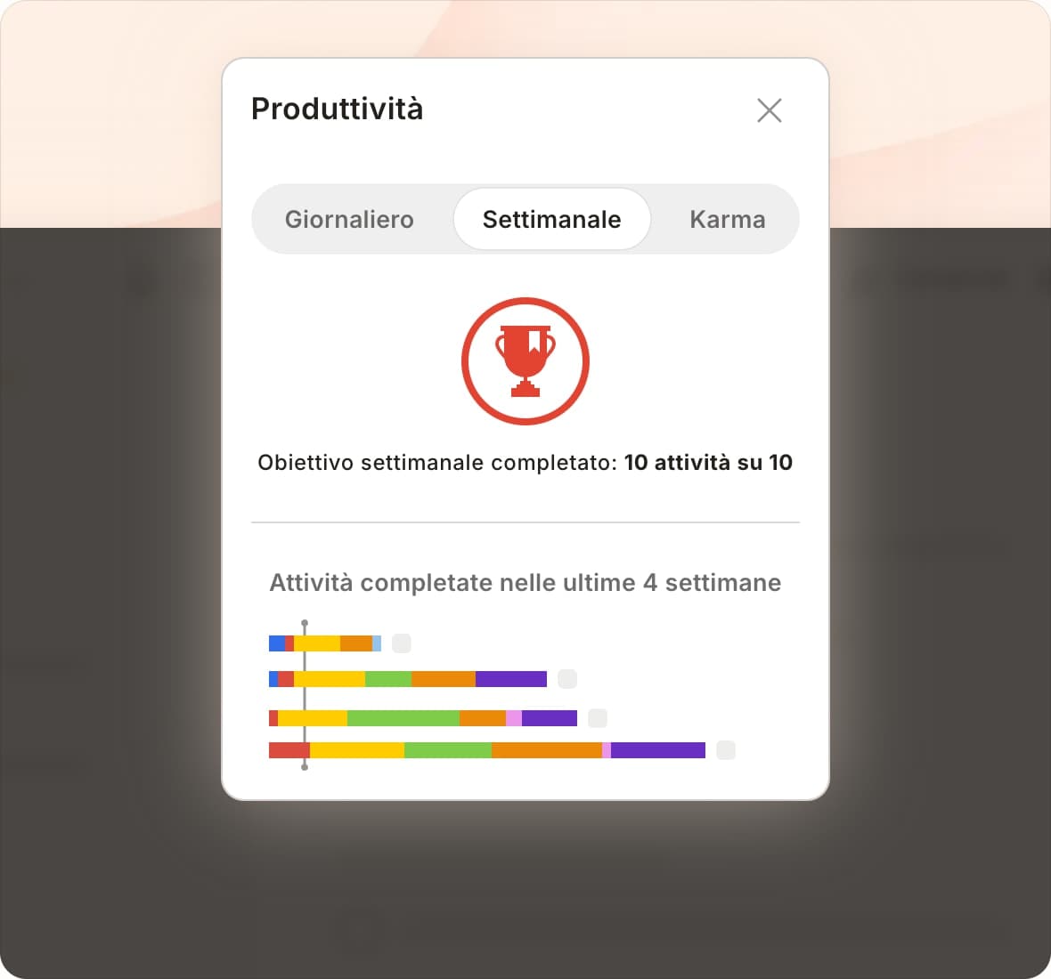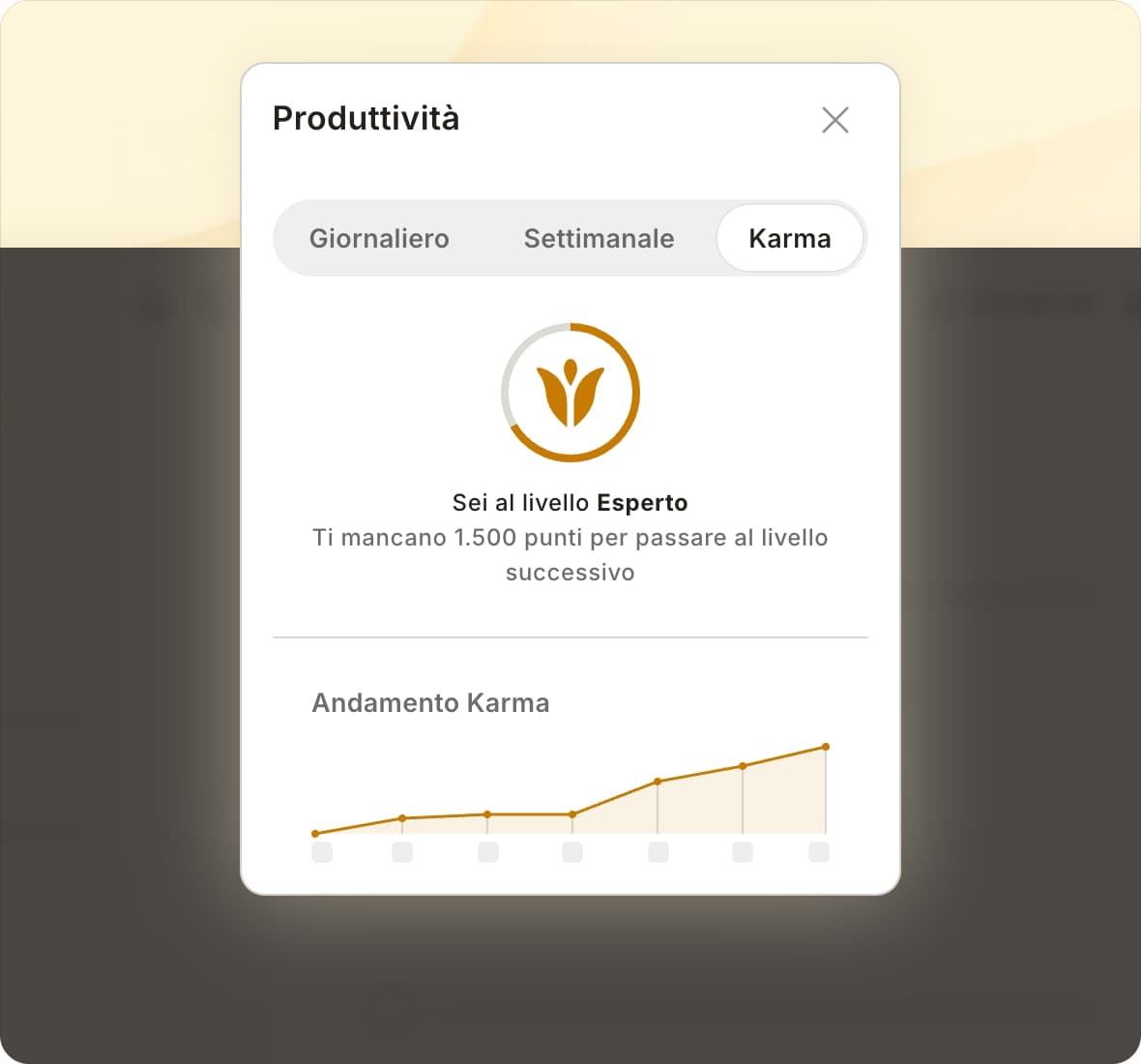 Ogni attività completata ti spinge avanti: accumula punti, sali di livello e padroneggia Todoist passo dopo passo.