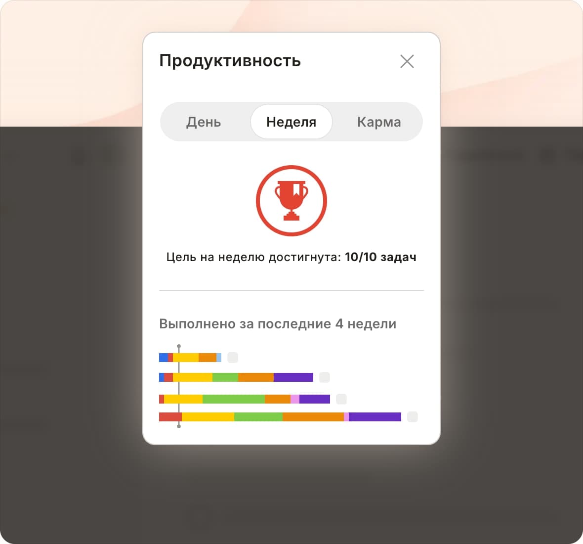 Выполняйте задачи, наращивайте темп и зарабатывайте баллы, чтобы повышать свой уровень на пути к мастерству в Todoist.