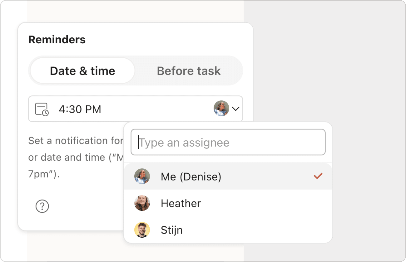 Todoist te sugiere recordatorios útiles de manera proactiva, lo cual ayuda a aliviar tu carga mental. Si utilizas la versión de Todoist para escritorio o la web, solo tienes que introducir el signo de exclamación ! para abrir una lista de sugerencias de recordatorios. Si estás en un dispositivo móvil, las sugerencias aparecerán inmediatamente después de tocar el chip Recordatorios en la vista de tarea.