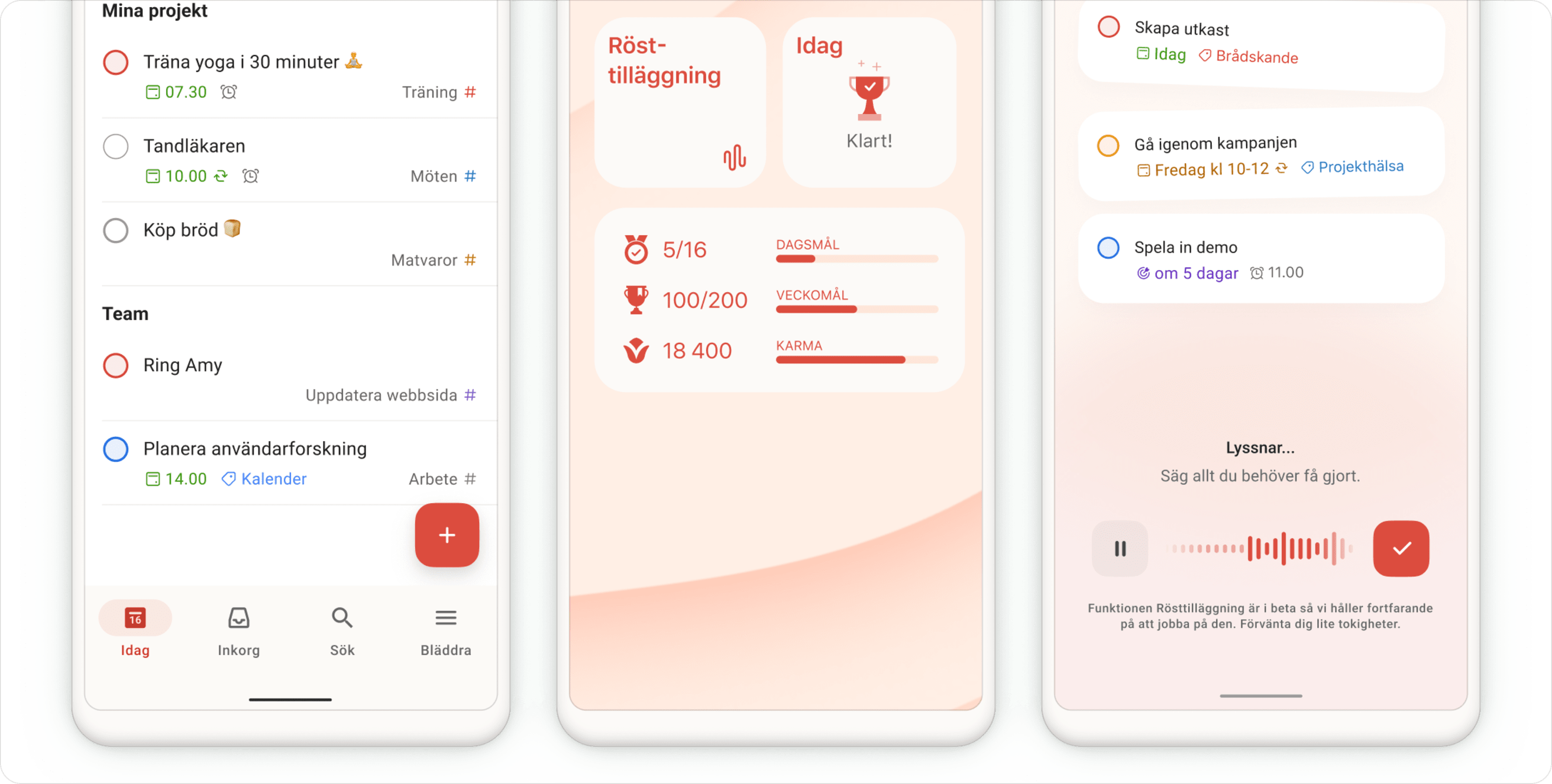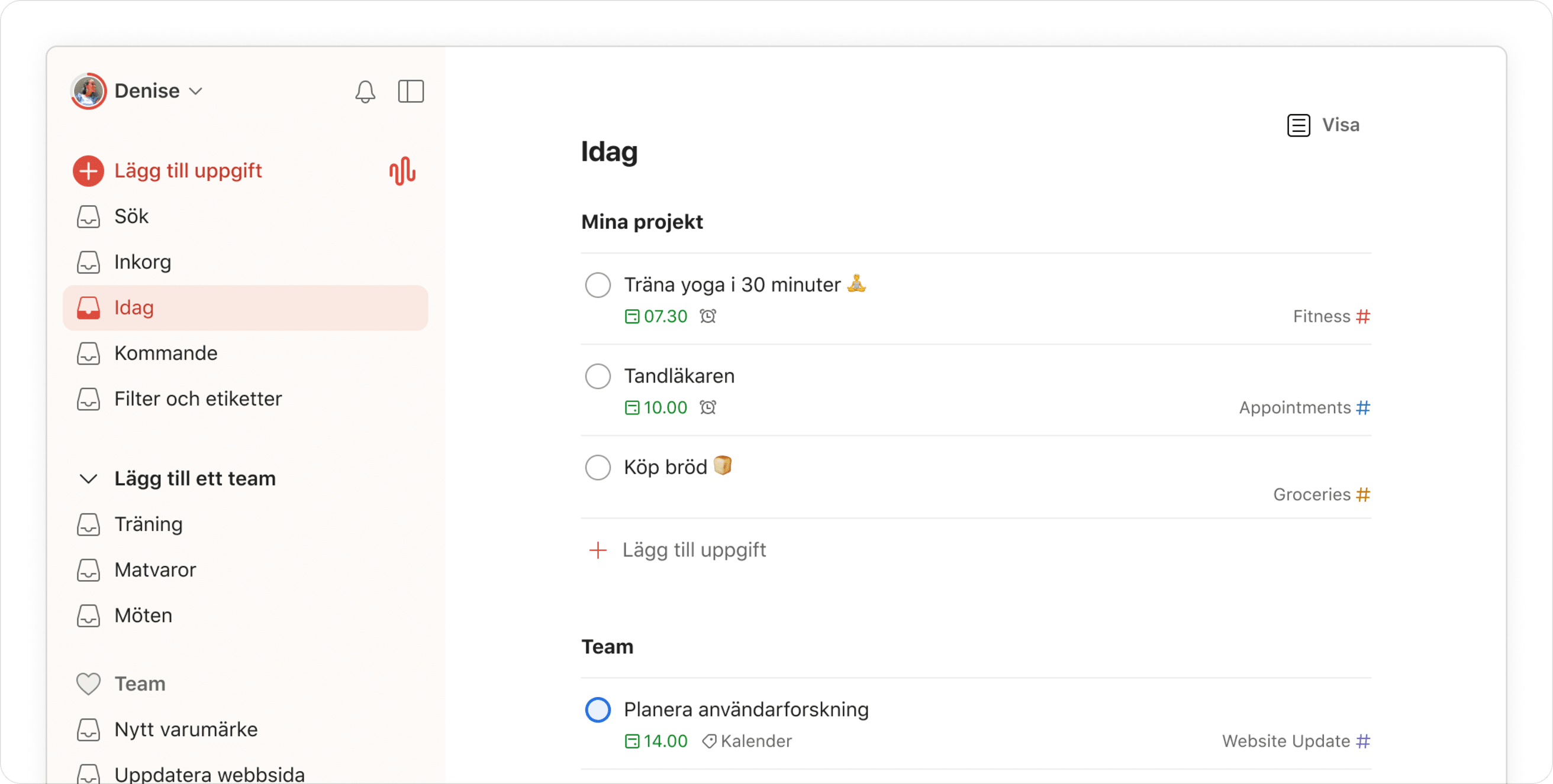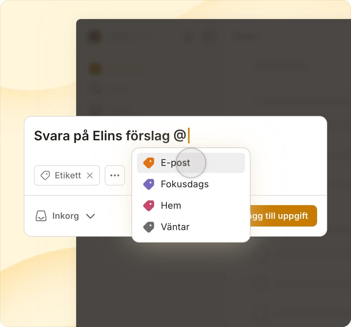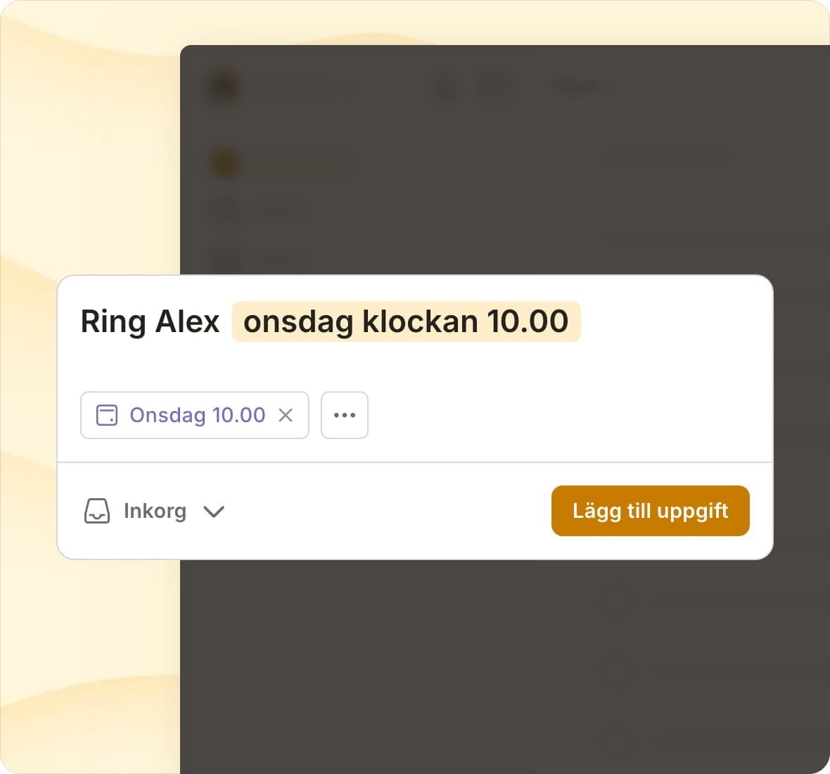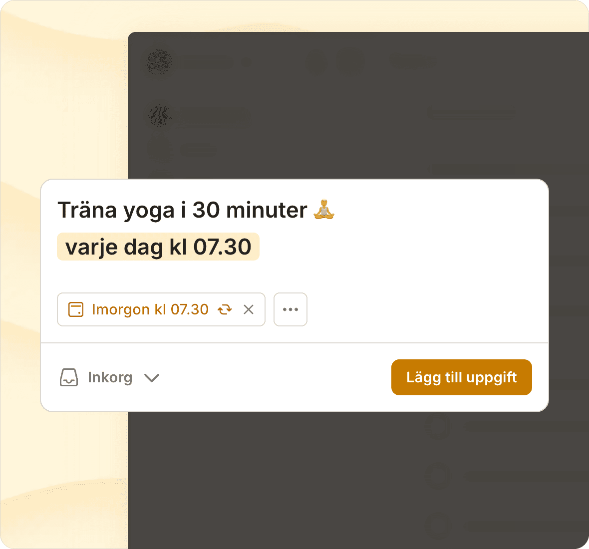 Skriv in uppgifter på ren svenska och se hur Todoist automatiskt kategoriserar, sätter etiketter på och schemalägger dem.