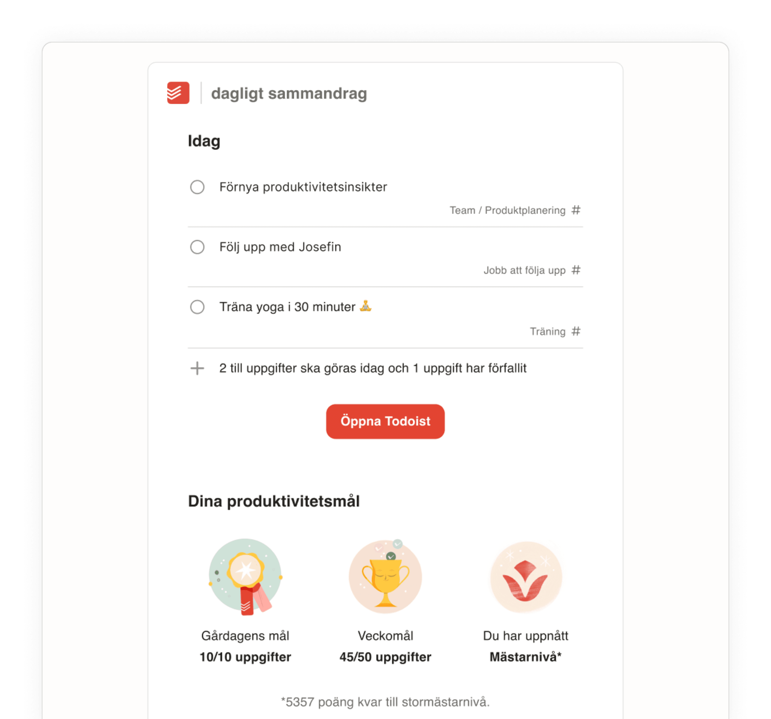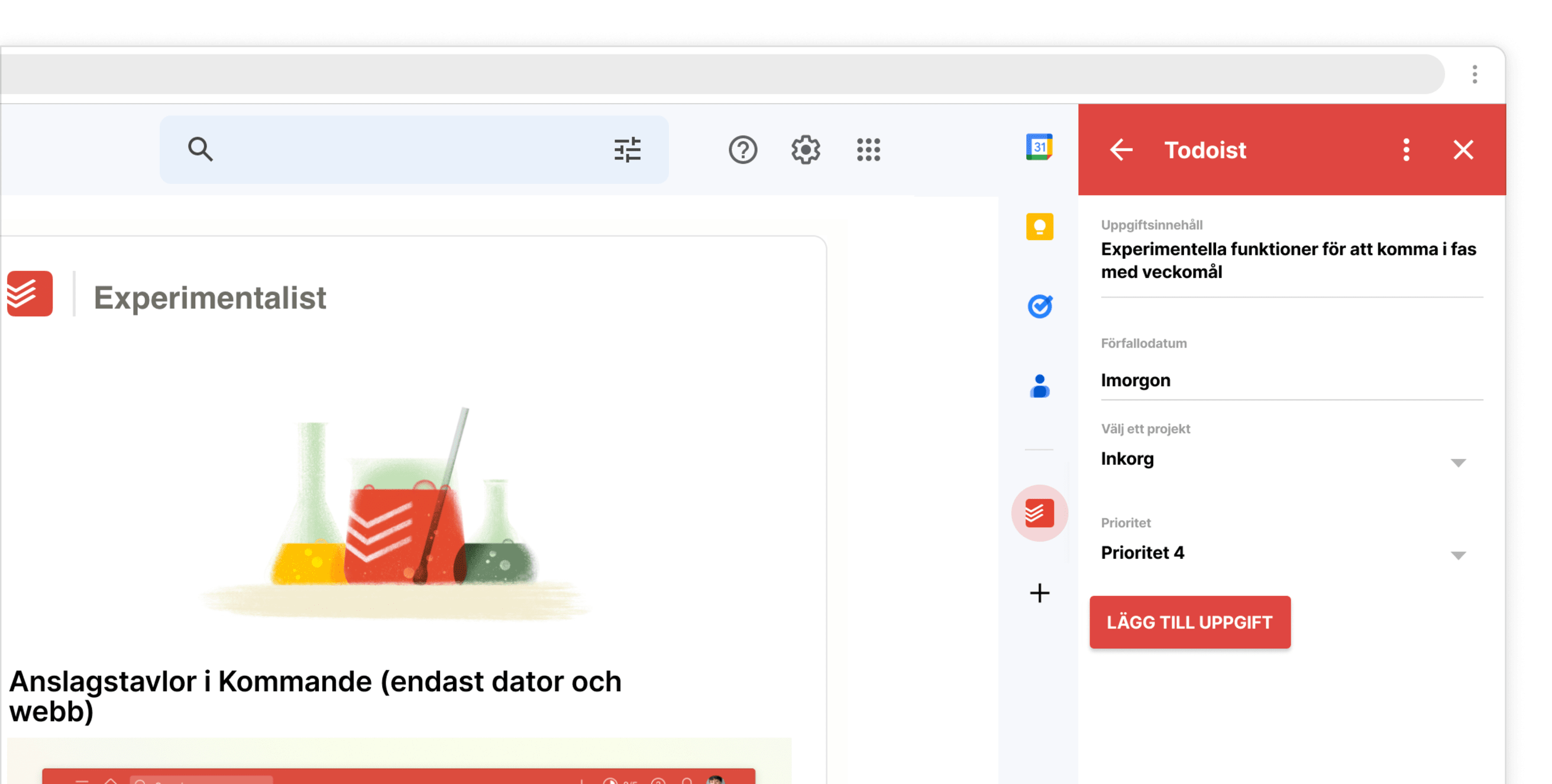 Anslut Todoist till din e-post, Slack, tidsmätarapp och över 50 andra verktyg utan att lämna ditt arbetsflöde.