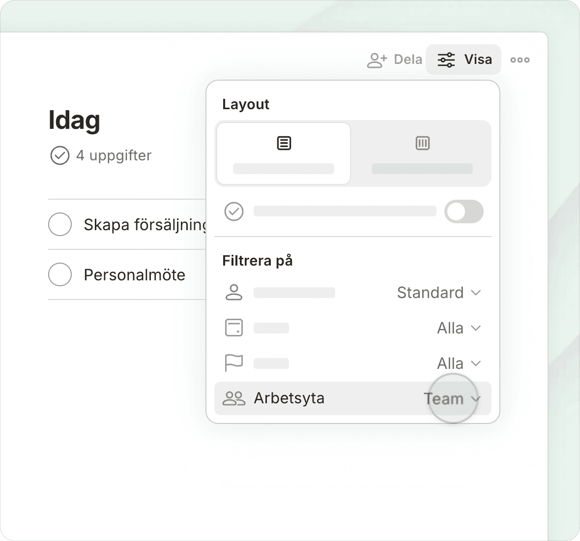 Växla mellan vyer med ett tryck för att se dagens prioriteter, projektdeadliner, kommande arbete eller anpassade filtrerade vyer.