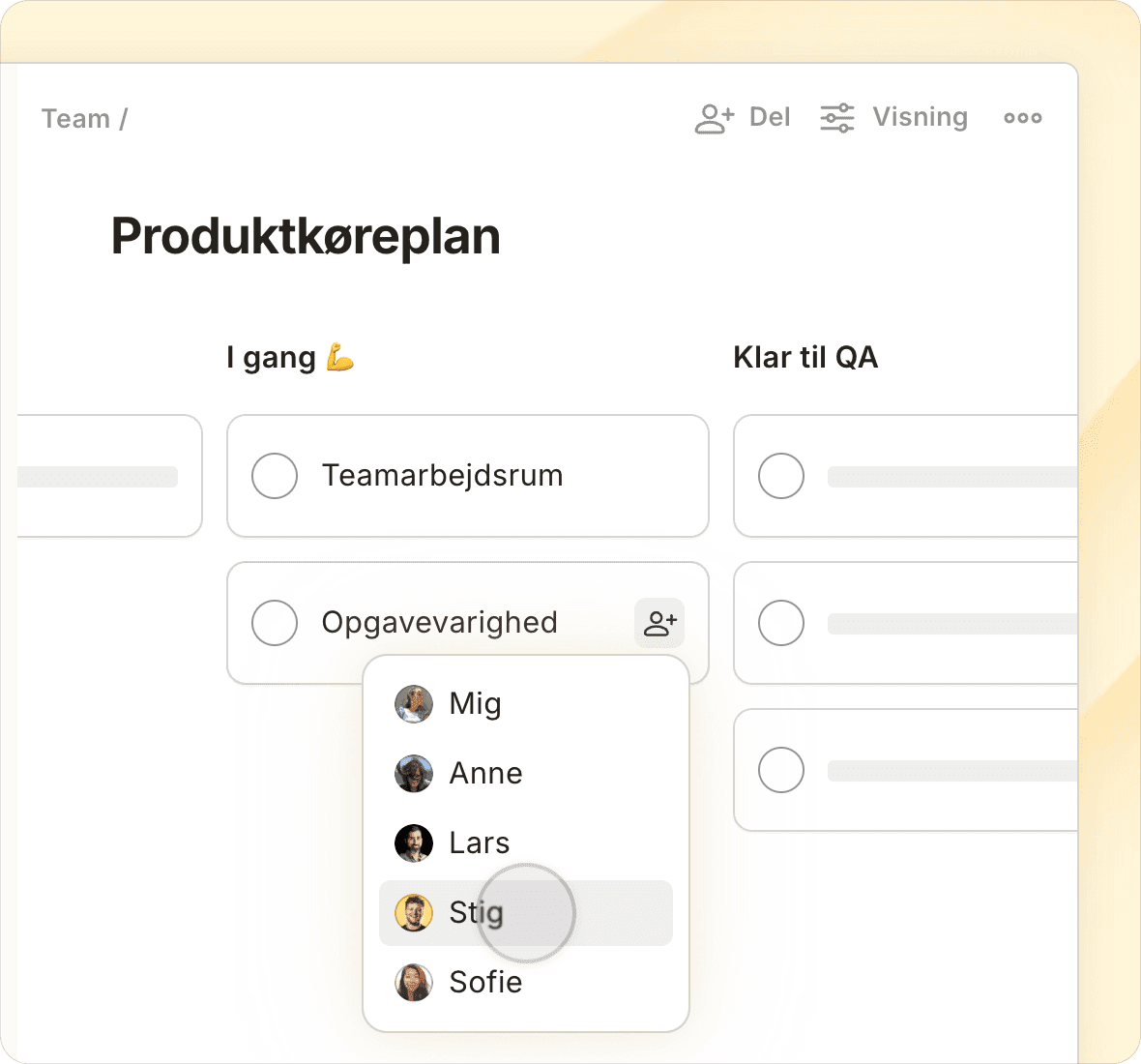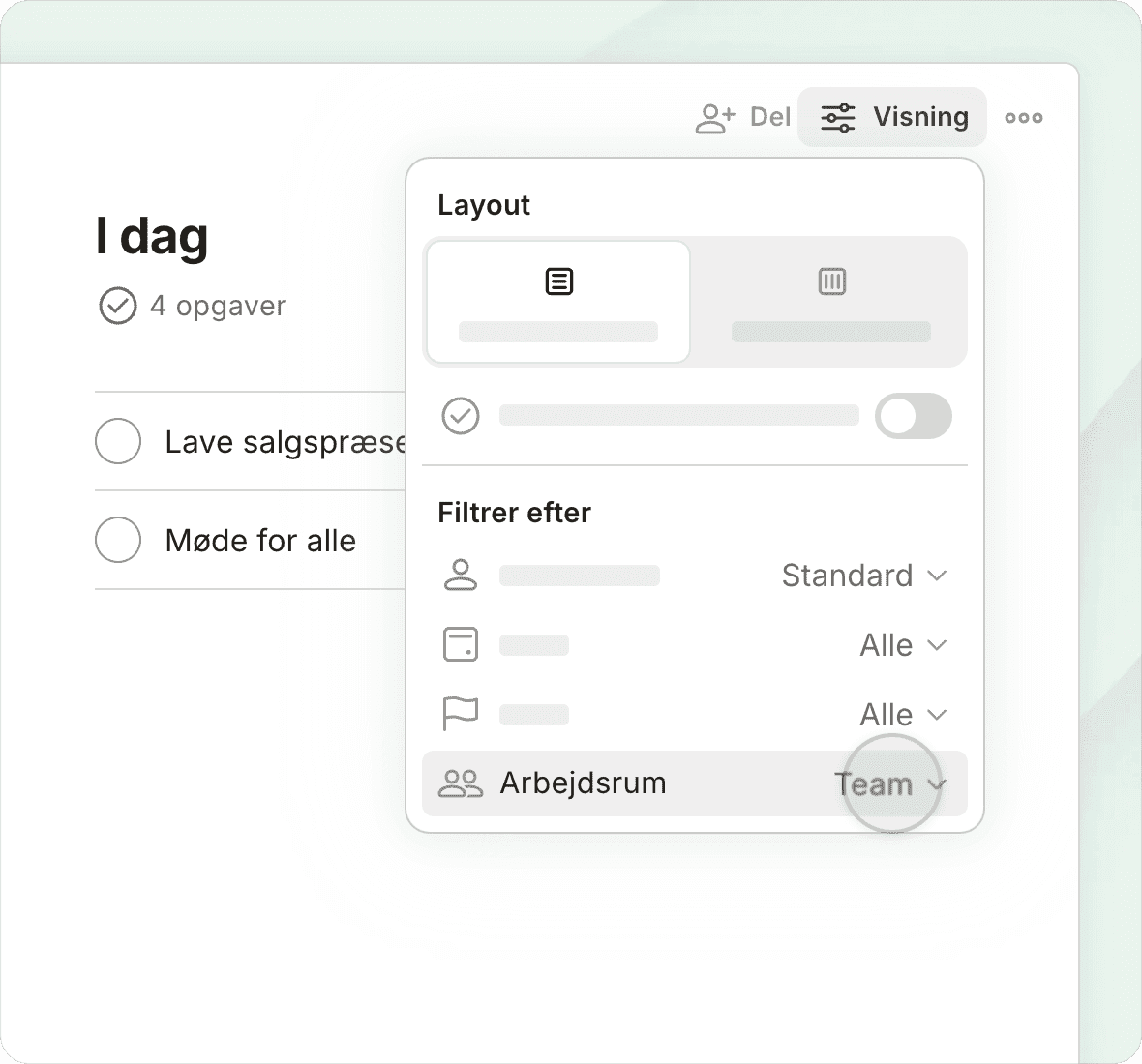 Skift visninger med et enkelt tryk og se dagens prioriteter, projektdeadlines, kommende arbejde eller tilpassede filtrerede visninger.