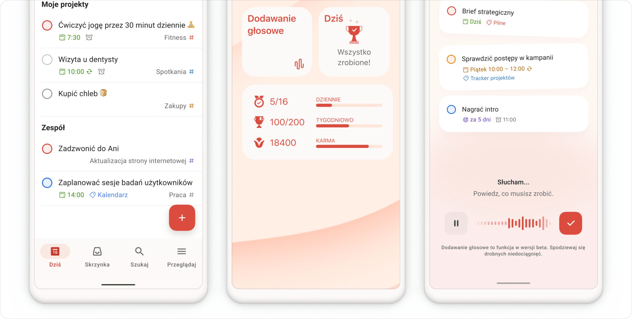 Przeglądaj zadania na telefonie, dodawaj je z laptopa, wykonuj je z zegarka. Następnie zobacz, jak wszystko synchronizuje się na bieżąco.