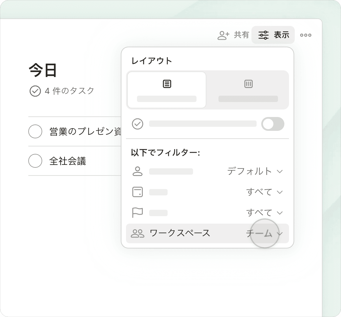 ワンタップで画面を切り替えて、今日の優先度、プロジェクトの締切、近日予定の仕事、カスタム フィルター画面を確認しましょう。