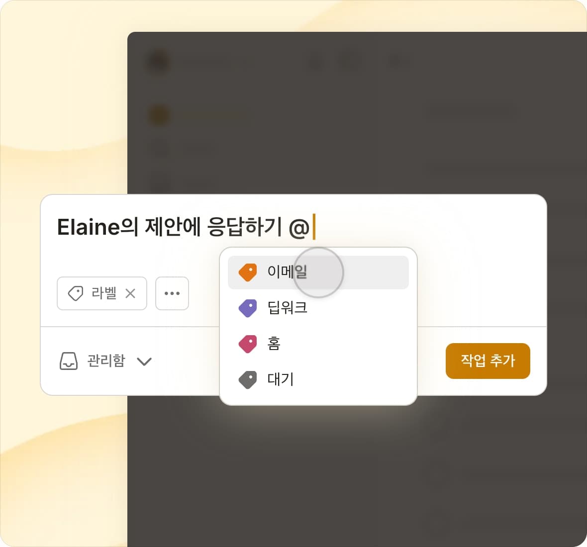 자연스럽게 작업을 입력하면 Todoist가 자동적으로 작업을 분류하고, 라벨을 표시하고, 일정을 정해 줍니다.
