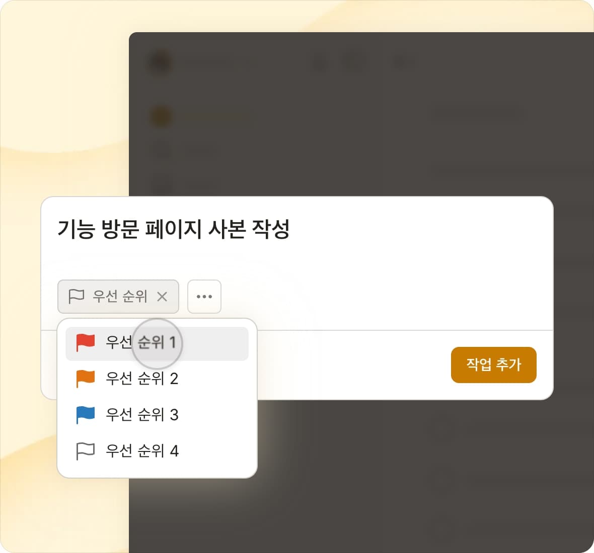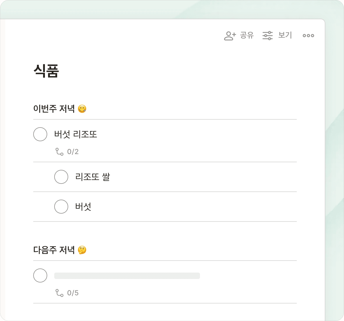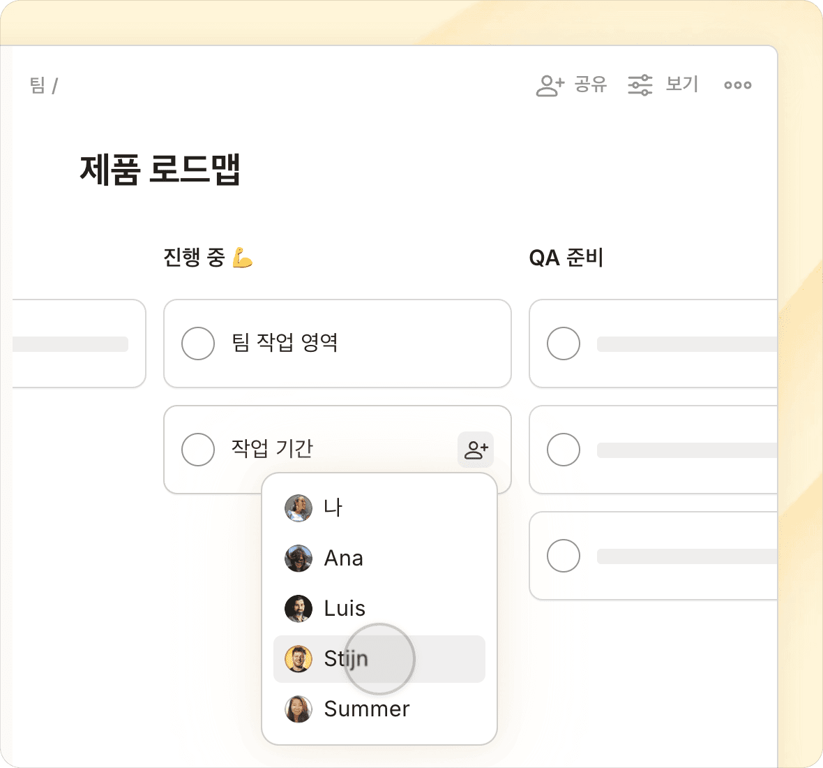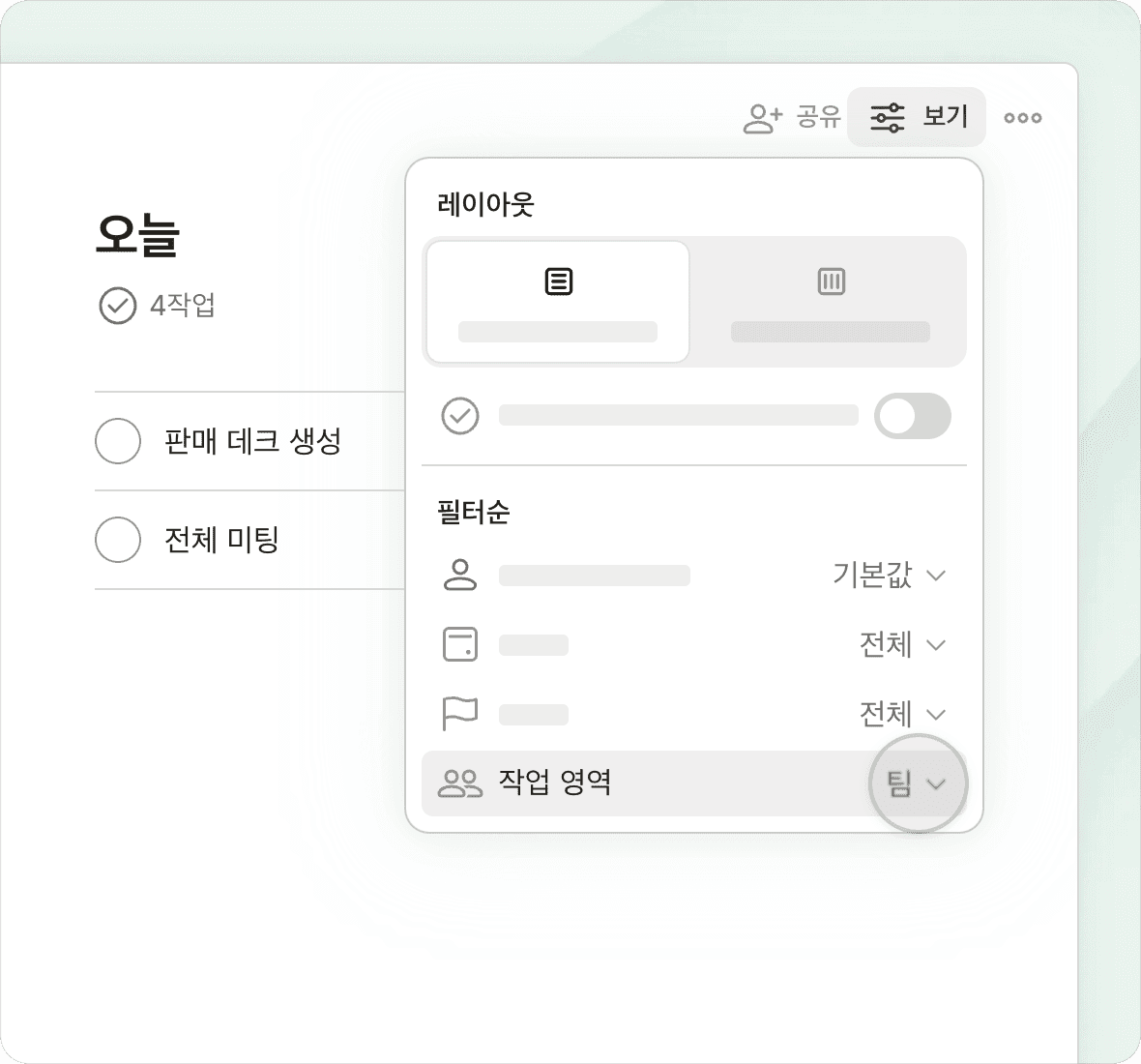 탭 한 번으로 보기를 전환하여, 우선순위, 프로젝트 마감일, 예정된 작업 또는 사용자 정의 필터링된 보기를 확인하세요.