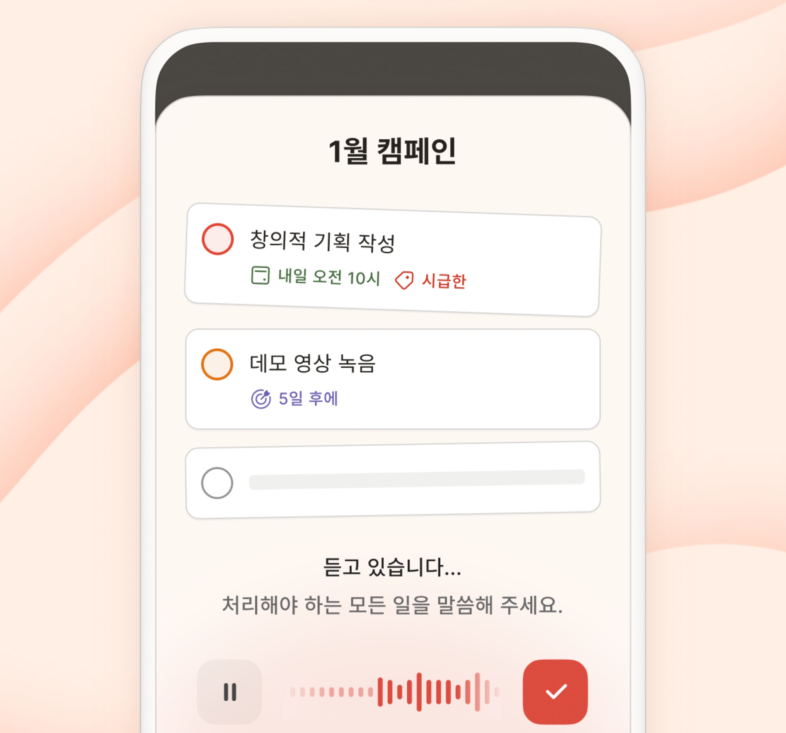 폰에서 작업을 검토하고, 노트북에서 추가하고, 워치에서 완료하세요. 그 다음, 모든 것이 실시간으로 동기화되는 것을 확인하세요.