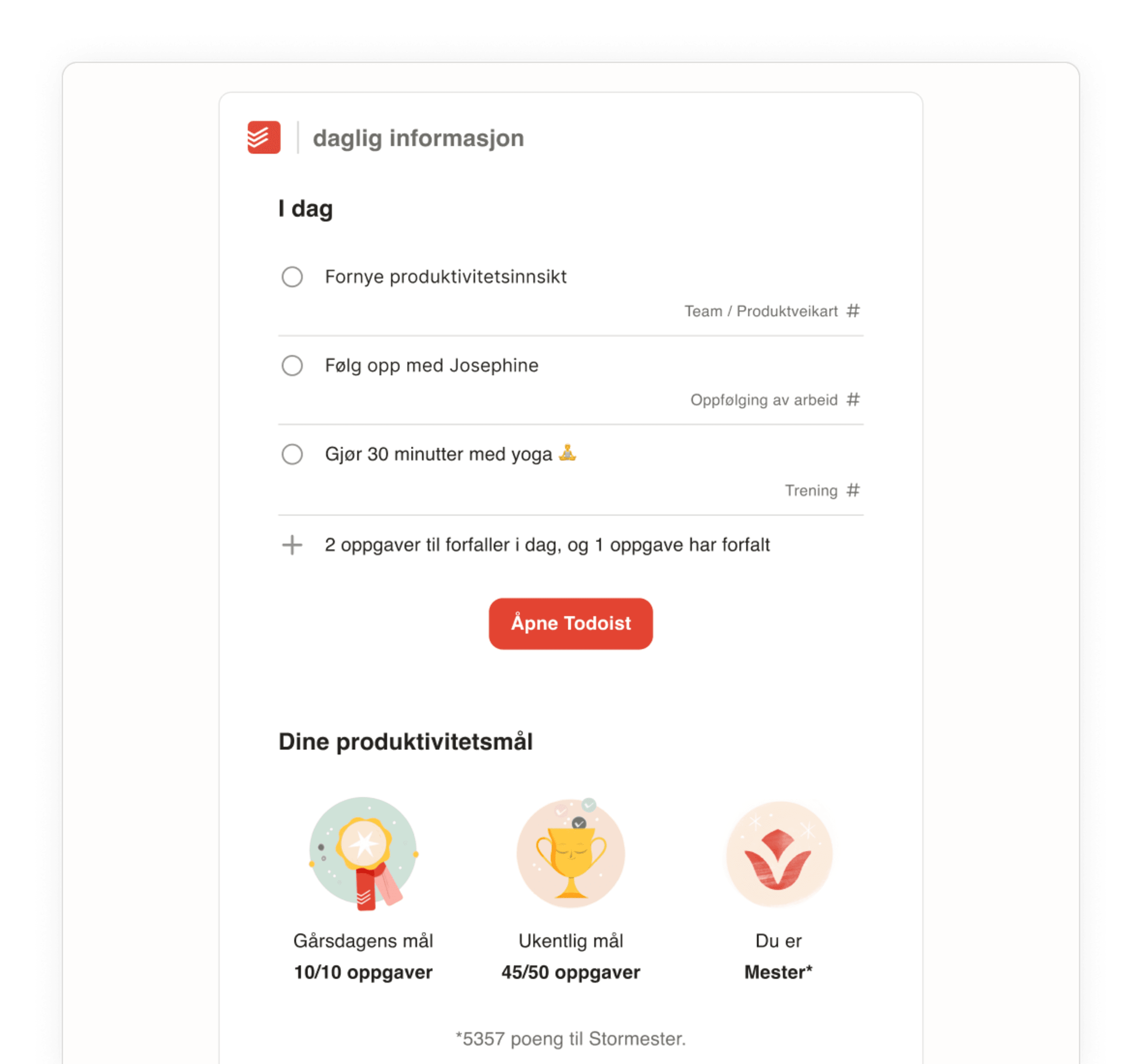 Koble Todoist til e-posten din, Slack, tidssporeren og over 50 andre verktøy – helt uten å forlate arbeidsflyten din.
