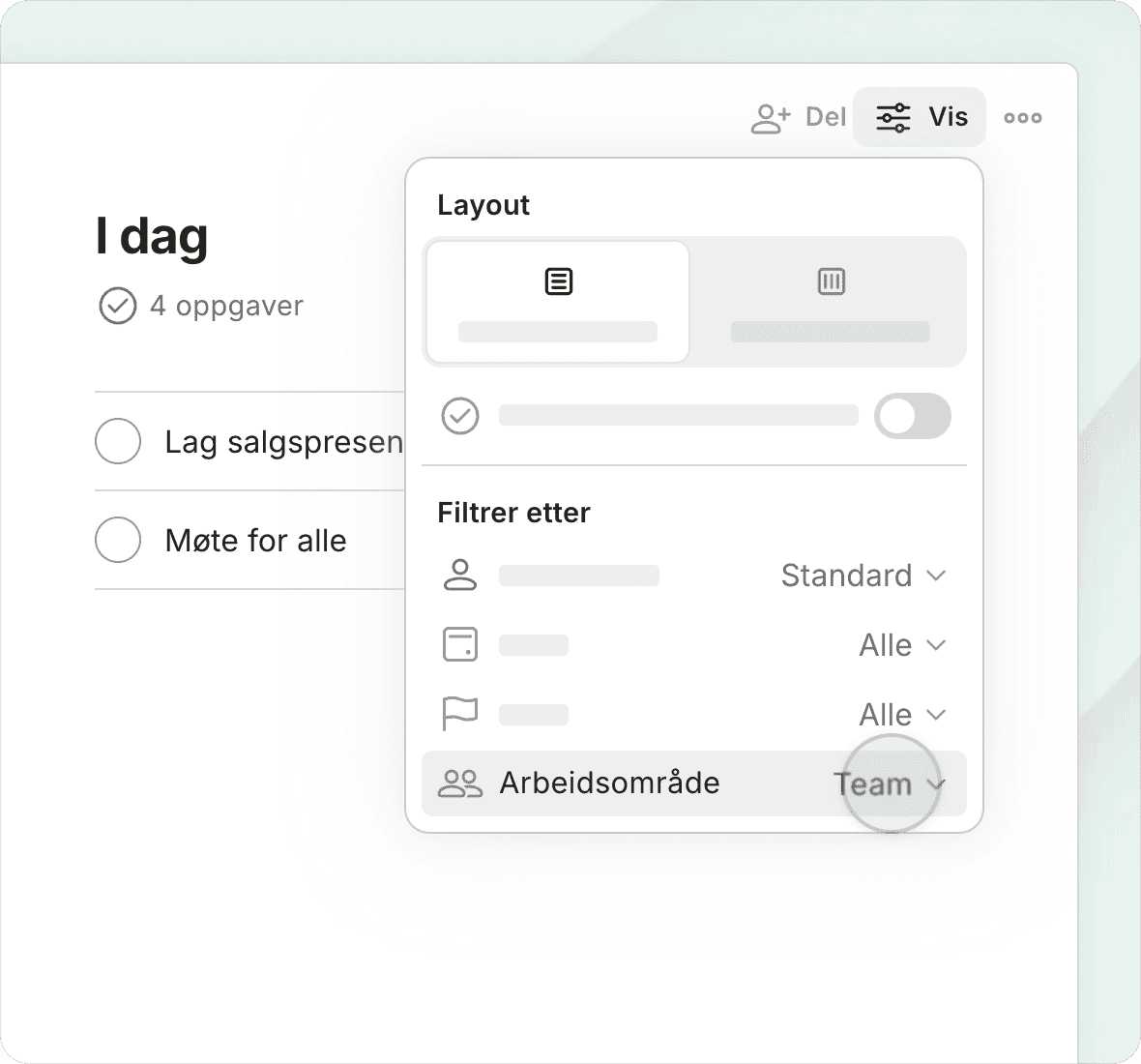 Bytt visninger med ett enkelt trykk, og se dagens prioriteringer, prosjektfrister, kommende arbeid eller tilpassede filtrerte visninger.
