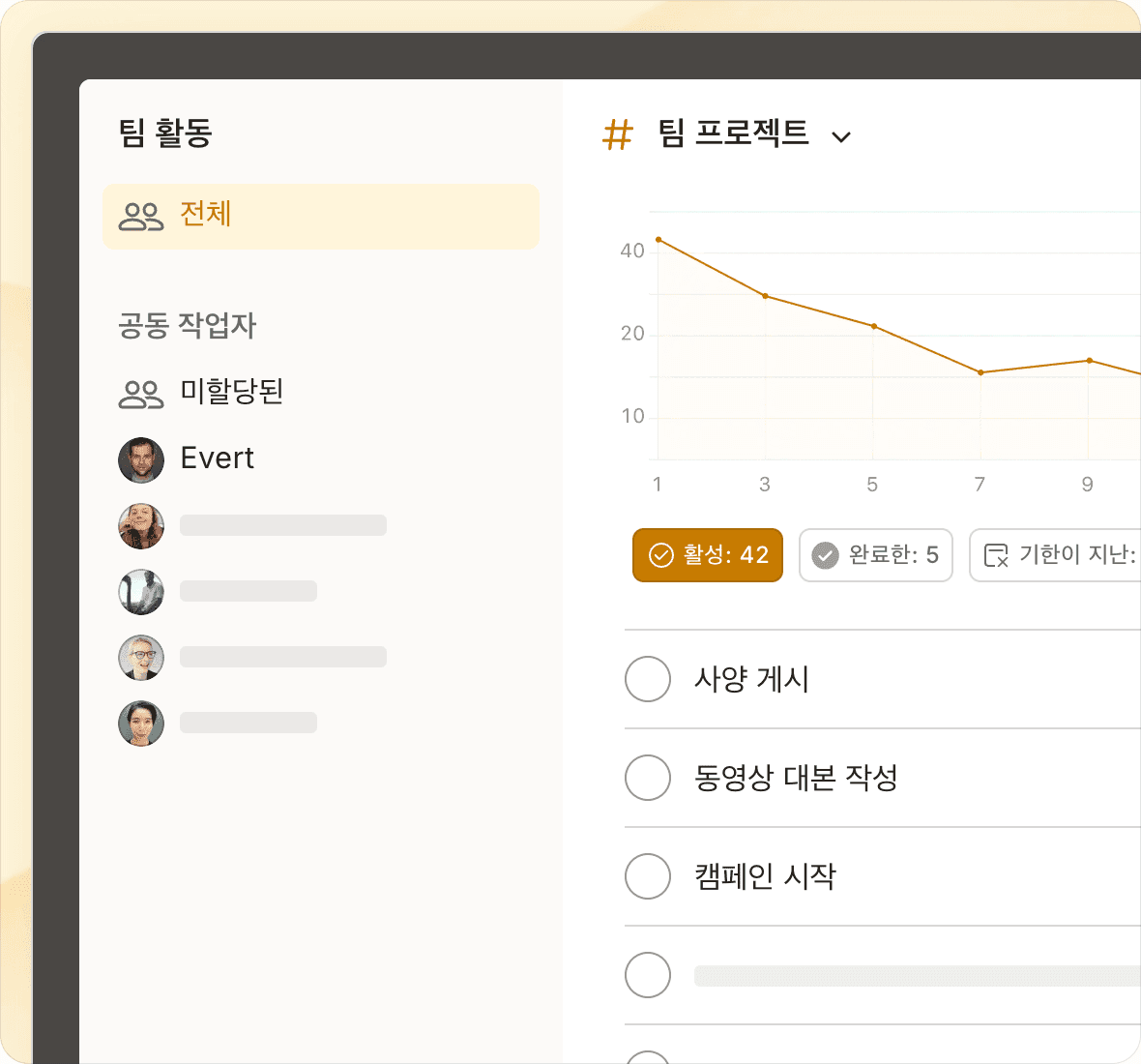 공유 작업, 프로젝트 및 마감일 파악하세요. 일을 지나치게 복잡하게 만들지 않고 일을 잘 수행하는 팀들로부터 신뢰를 받고 있습니다.