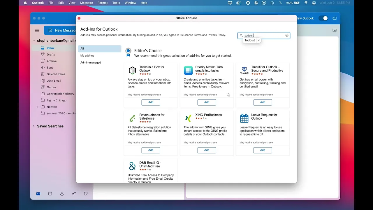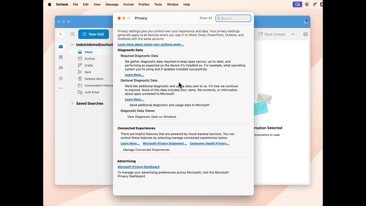 Si estás usando la app de escritorio de Outlook Mail para macOS o Windows, verifica si las Experiencias Conectadas están activadas antes de usar el complemento de Todoist.